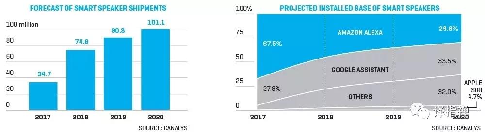 賭注如此之高,競爭激烈也不足為奇。 根據(jù)研究公司Canalys的數(shù)據(jù)顯示,亞馬遜最早進入市場并處于領(lǐng)先,在全球連接音箱市場占據(jù)42%的份額。